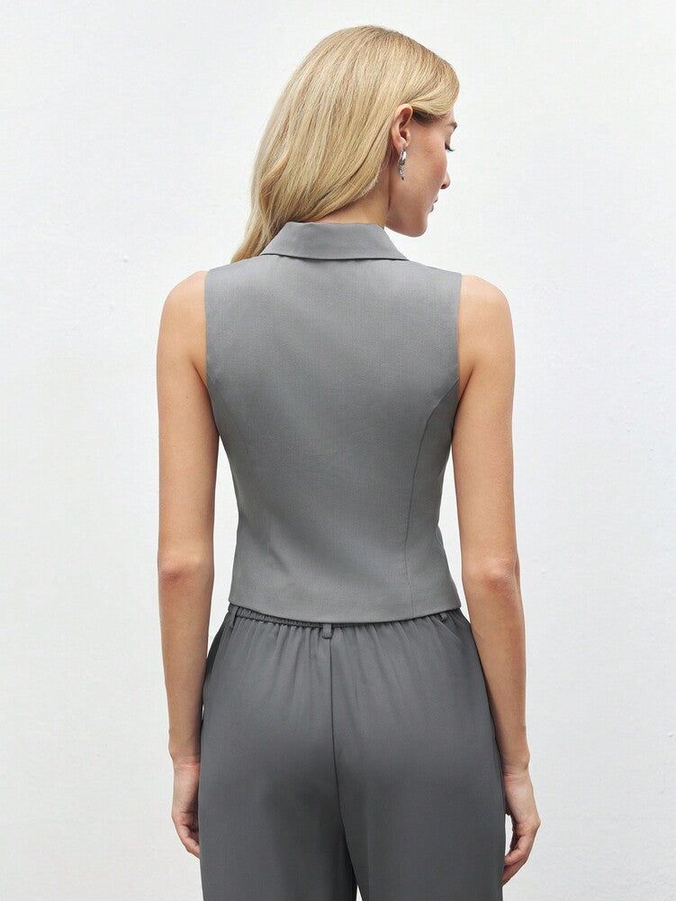 This sleeveless grey vest features an elegant lapel neckline and an asymmetrical hem for a modern silhouette. Crafted from woven fabric with a slight stretch, it offers a comfortable regular fit and is fully lined for a polished look. The vest is detailed with stylish buttons and is ideal for spring and fall wear, making it suitable for Ramadan, Id al-Adha, and Eid al-Fitr celebrations. Easy to care for with machine wash or professional dry clean options, it combines sophistication with practicality for versatile wardrobe styling.