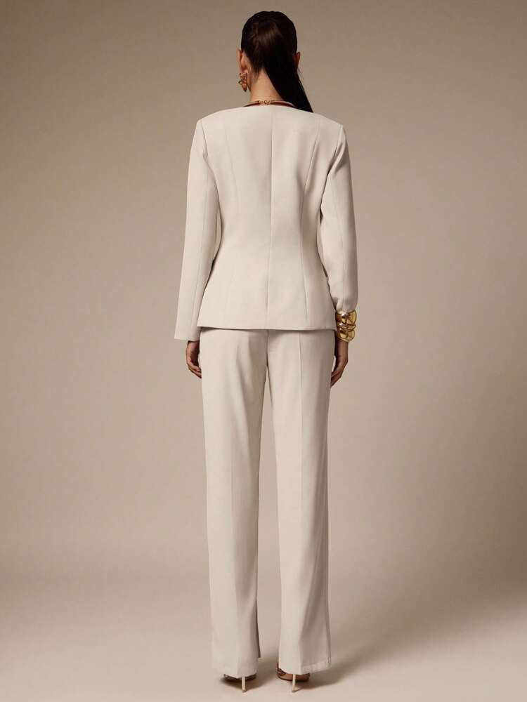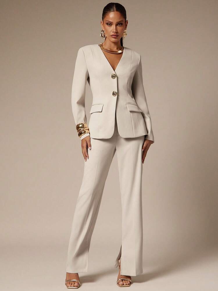 This women's long sleeve suit jacket features a slim fit and V-neck design, crafted from 100% woven polyester for a structured, non-stretch feel. Its plain khaki color and button-front with pocket details create an elegant, professional look ideal for office wear or business casual occasions. Lightweight and unlined, it suits spring and fall temperatures between 18–25°C. This single-breasted jacket combines refined style with practicality, perfect for festive events like Ramadan, Eid al-Fitr, and Id al-Adha. Care with hand washing or professional dry cleaning to maintain its quality.